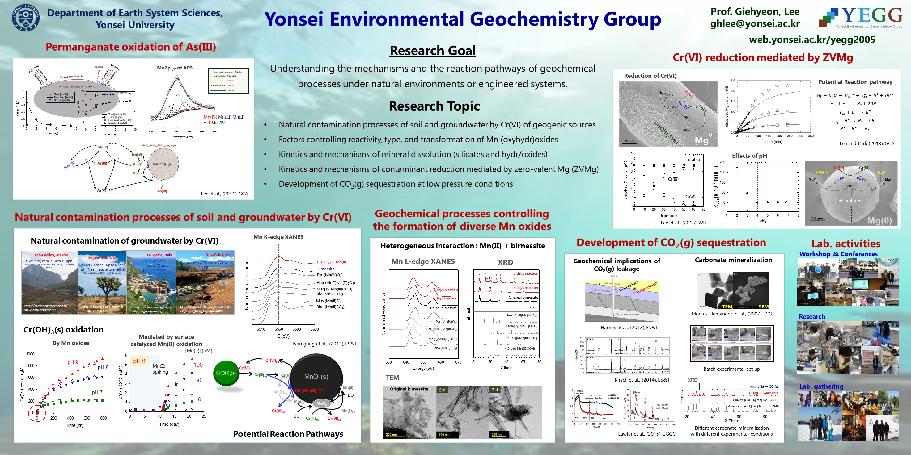 - Manganese (oxyhydr)oxides (hereafter referred to as ‘Mn oxides’) are widely distributed in most geological environments and found in more than 30 different types. In particular, each type of Mn oxides is characterized by distinct reactivity depending on its physicochemical properties (i.e., crystal structure and the valence state of structural Mn). In the natural environment, Mn oxides may play a key role in controlling the fate and transport of various inorganic and organic substances by participating in complex (bio)geochemical processes. It is well known that during (bio)geochemical processes including homogeneous, surface catalyzed, or microbial Mn(II) oxidation processes, formation and phase transformation of numerous types of Mn oxides may occur. Here, we are attempting to experimentally determine abiotic geochemical processes and factors controlling the pathways of the formation and the phase transformation of various Mn oxides which still have not been clearly understood yet.